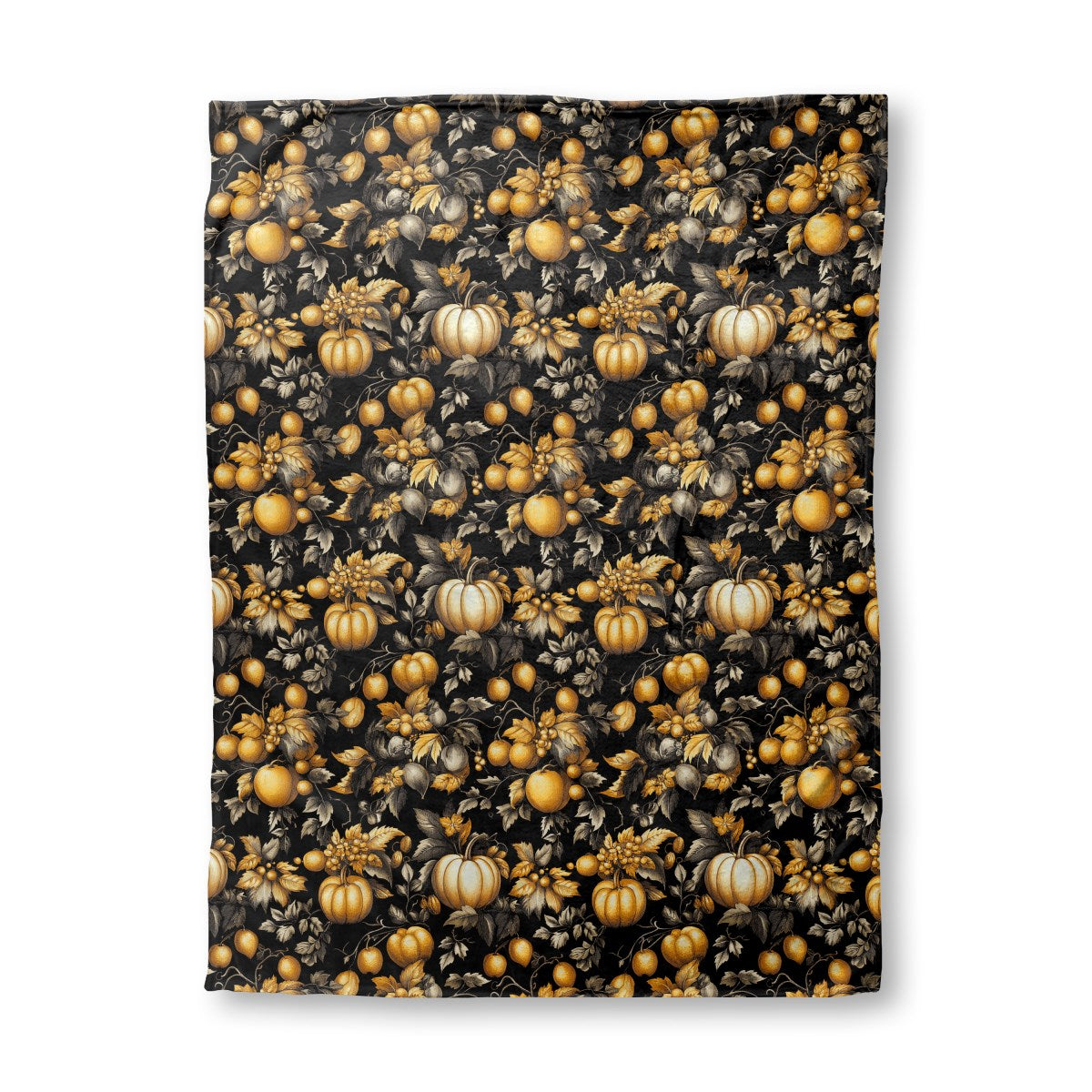 A luxurious, vintage-style pattern of autumnal fruits and foliage. Rendered in a detailed engraving style, golden pumpkins, apples, and grapes contrast richly with silver-toned leaves against a dramatic black background, creating an opulent and seamless design.