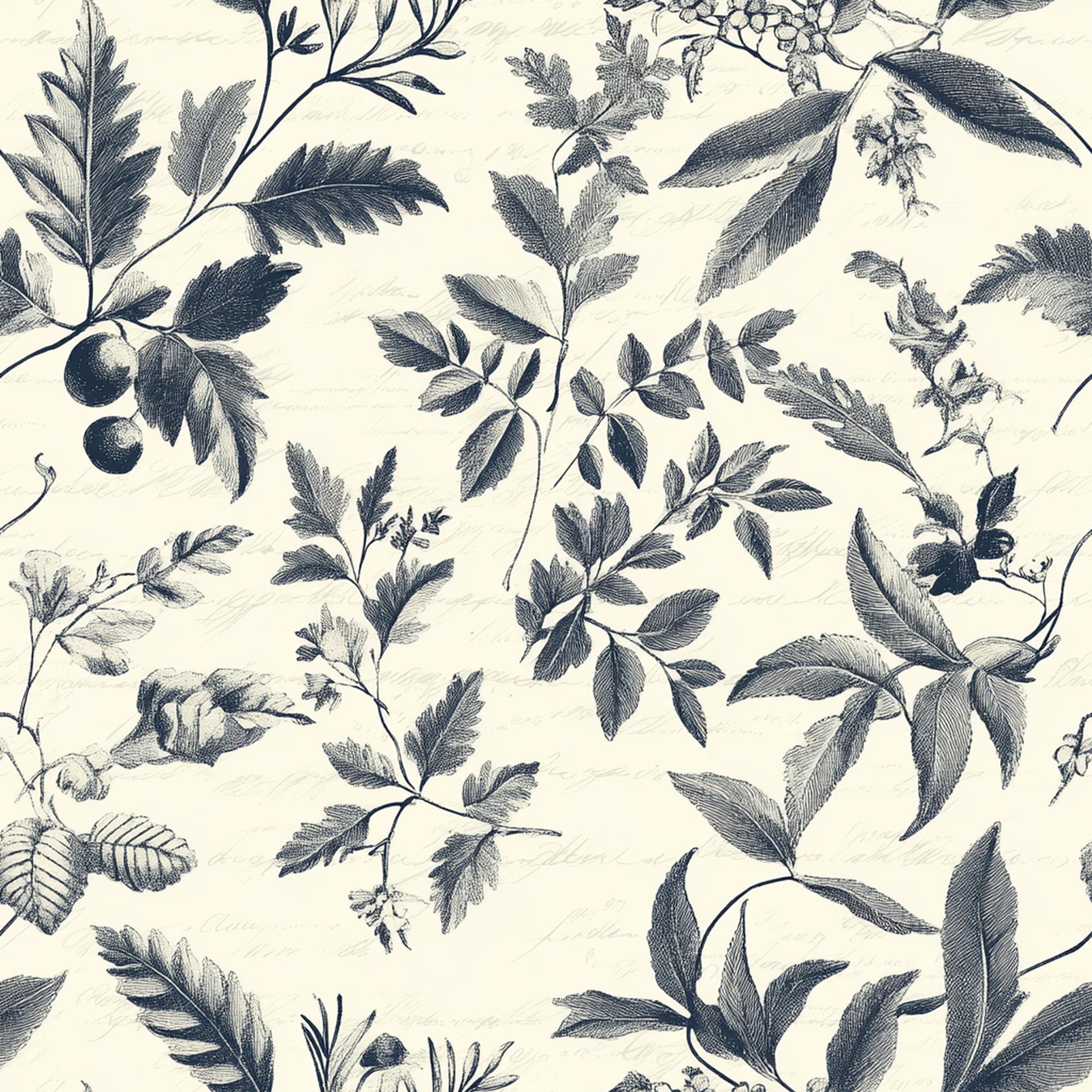 This seamless pattern features vintage-style botanical illustrations in dark blue. Detailed, engraved leaves, flowers, and berries are layered over a cream-colored background with faint, handwritten cursive script, creating a classic and elegant design.