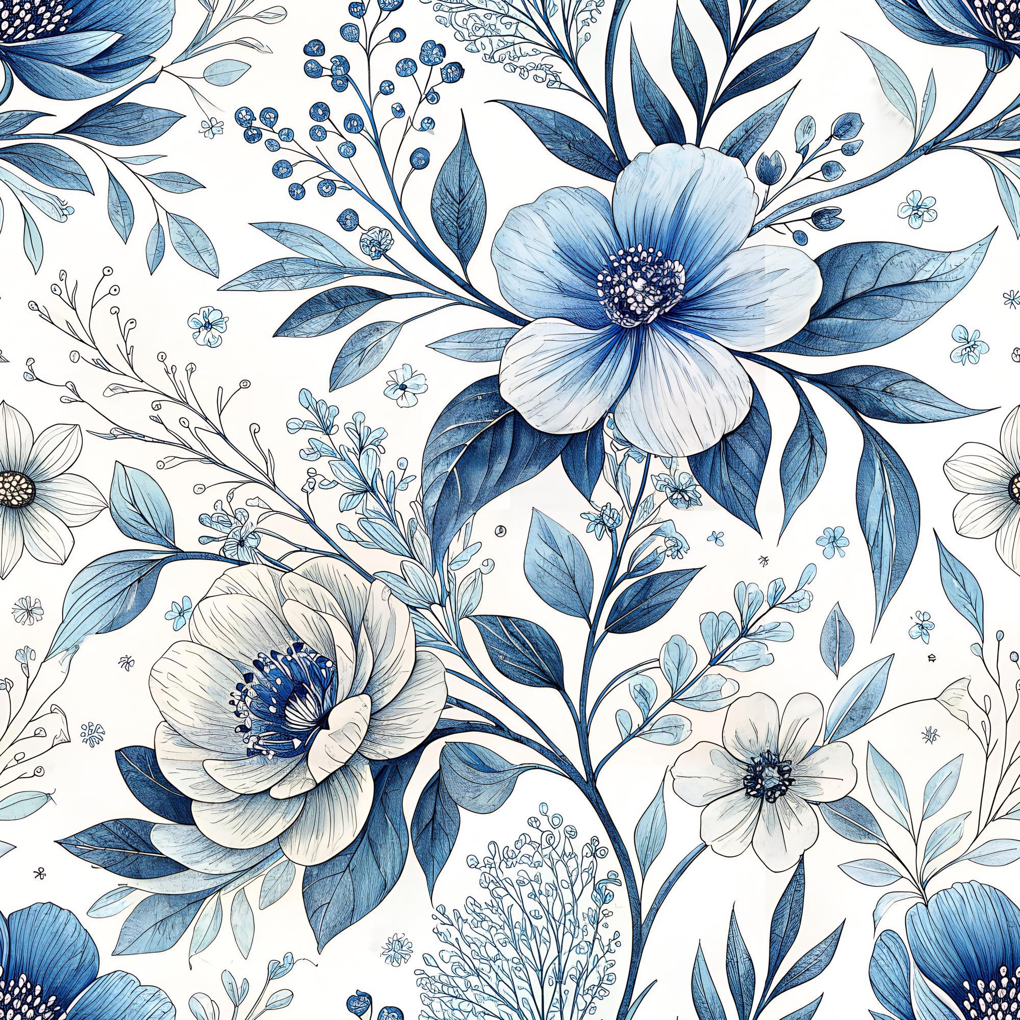 This is a delicate and intricate floral pattern featuring blue and white flowers, leaves, and berries. Rendered in a watercolor and ink-line style against a white background, the design creates a timeless and elegant botanical illustration.