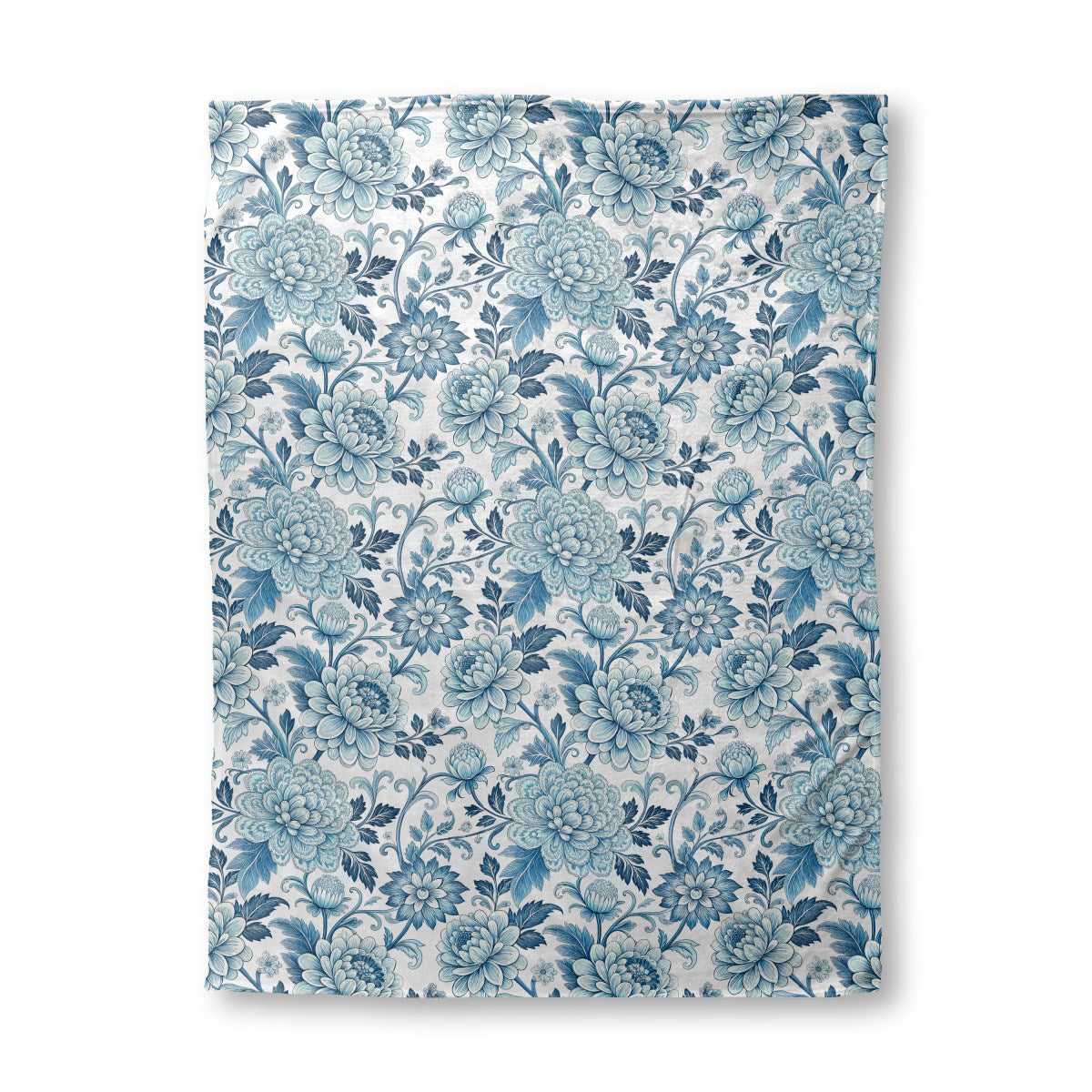 An elegant, seamless floral pattern in shades of blue on a white background. The design features large, stylized peonies or chrysanthemums with intricate linework, interwoven with scrolling vines and leaves, creating a classic, decorative look reminiscent of traditional porcelain.