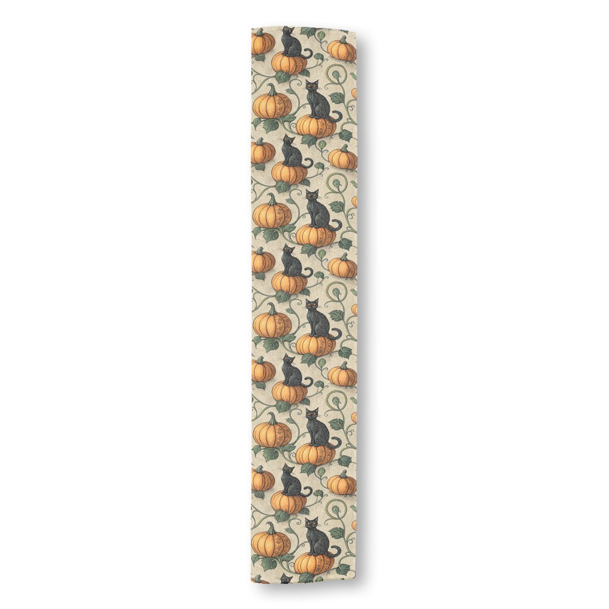 A vintage-style seamless pattern features black cats with glowing orange eyes perched on pumpkins. Swirling green vines and leaves connect the elements on a textured, light background, creating a classic Halloween-themed illustration with a slightly spooky feel.