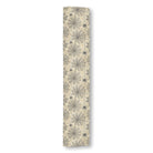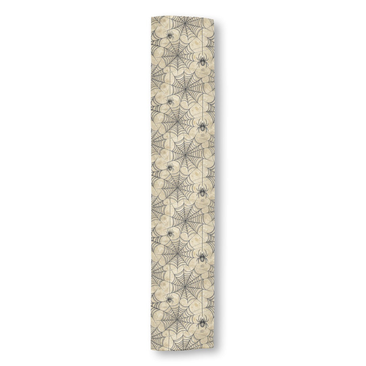 This vintage-style illustration features an intricate, repeating pattern of black spiderwebs on a textured, parchment-like background. Two detailed spiders are present, one crawling on a web and another dangling from a thread, creating a classic spooky or Halloween-themed design.