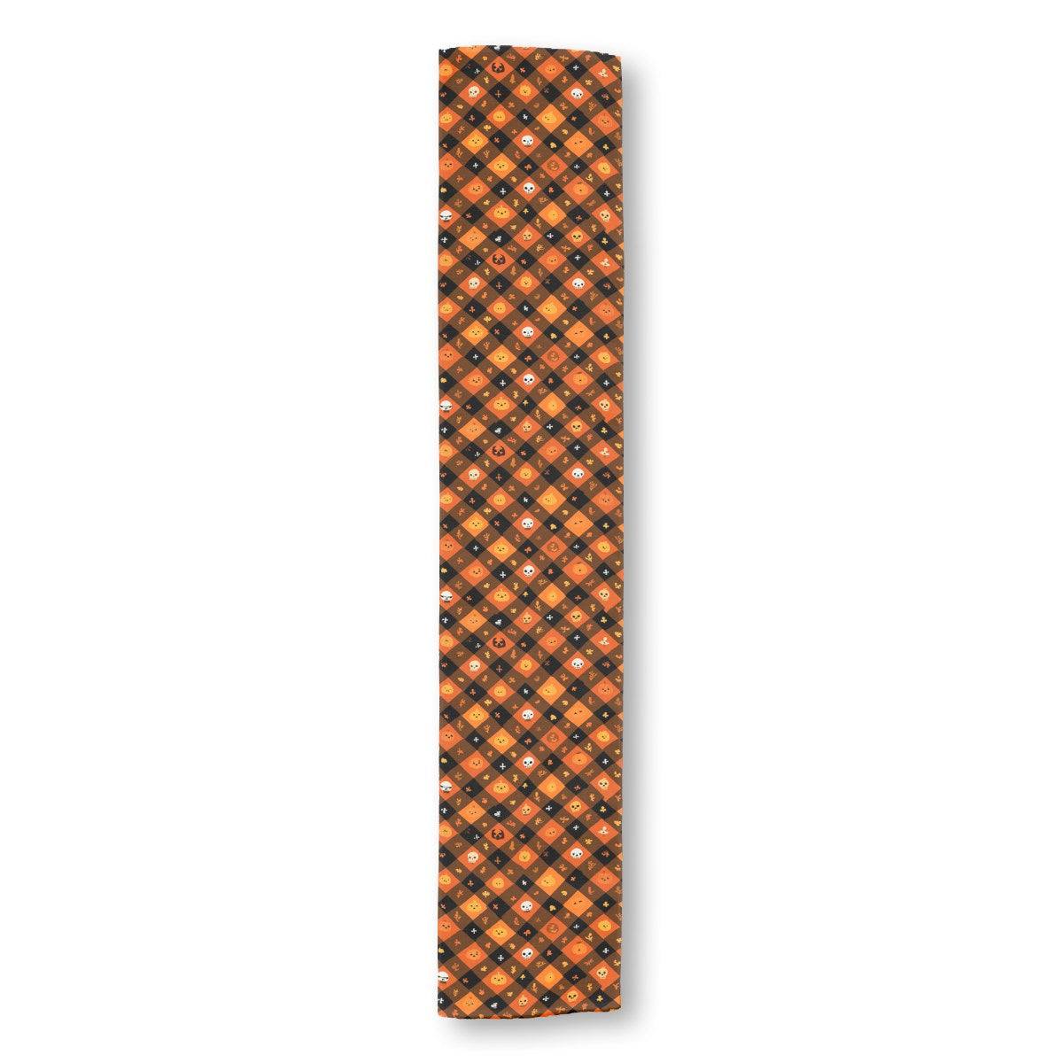 A whimsical, seamless Halloween pattern featuring a diagonal plaid in orange, black, and brown. The design is scattered with hand-drawn, cartoonish skulls, jack-o'-lanterns, and other small autumnal motifs, creating a festive and spooky-cute feel.