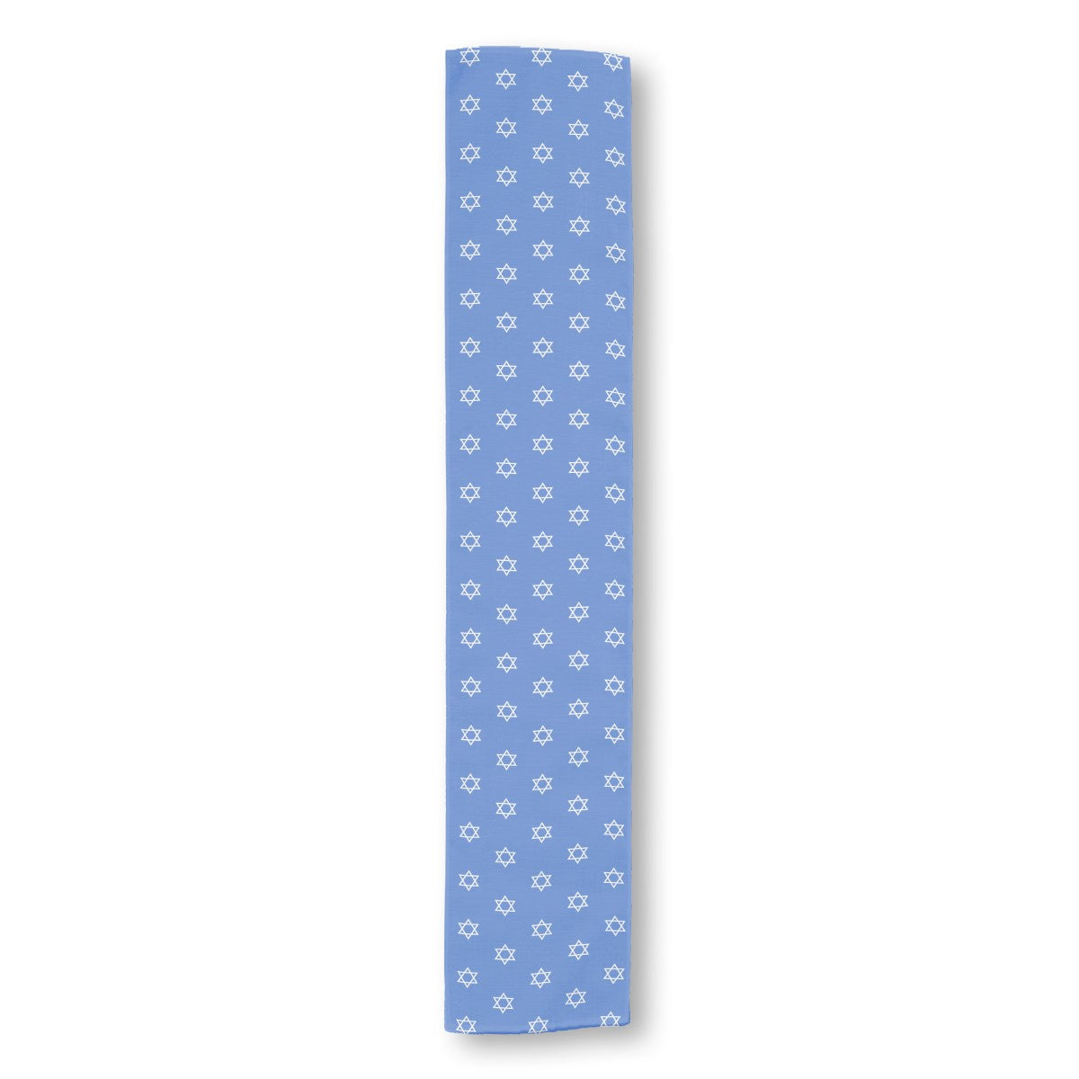 A seamless pattern features white Stars of David, a well-known symbol of Judaism, arranged in an orderly grid against a solid blue background.