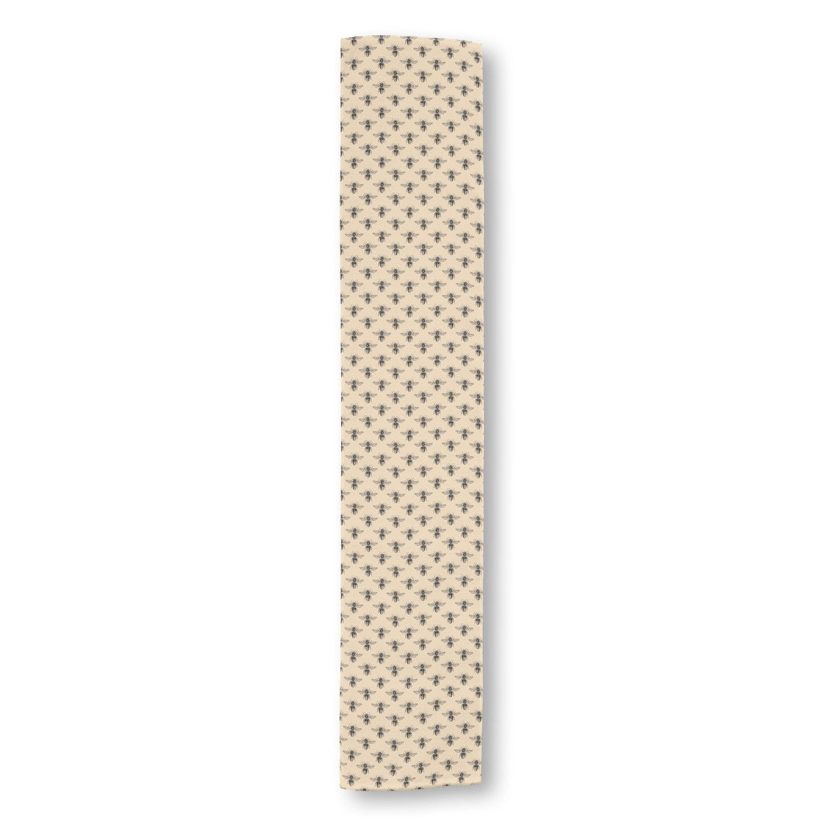 A vintage-style wallpaper pattern features detailed, black-ink illustrations of bees. The insects are arranged in a uniform grid against a solid, light tan background, creating a classic, entomological design.
