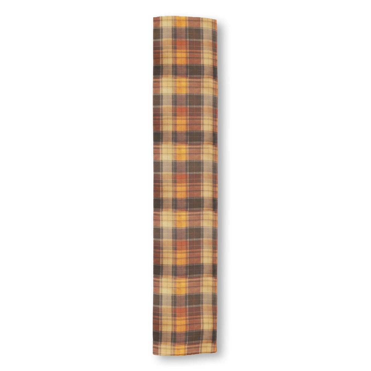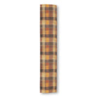 A close-up of a textured plaid fabric in a warm, autumnal color palette. The classic tartan pattern features intersecting stripes of brown, orange, mustard yellow, and beige, creating a cozy and rustic look.