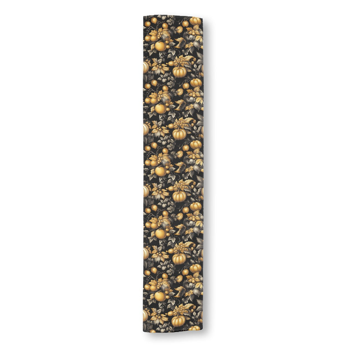 A luxurious, vintage-style pattern of autumnal fruits and foliage. Rendered in a detailed engraving style, golden pumpkins, apples, and grapes contrast richly with silver-toned leaves against a dramatic black background, creating an opulent and seamless design.