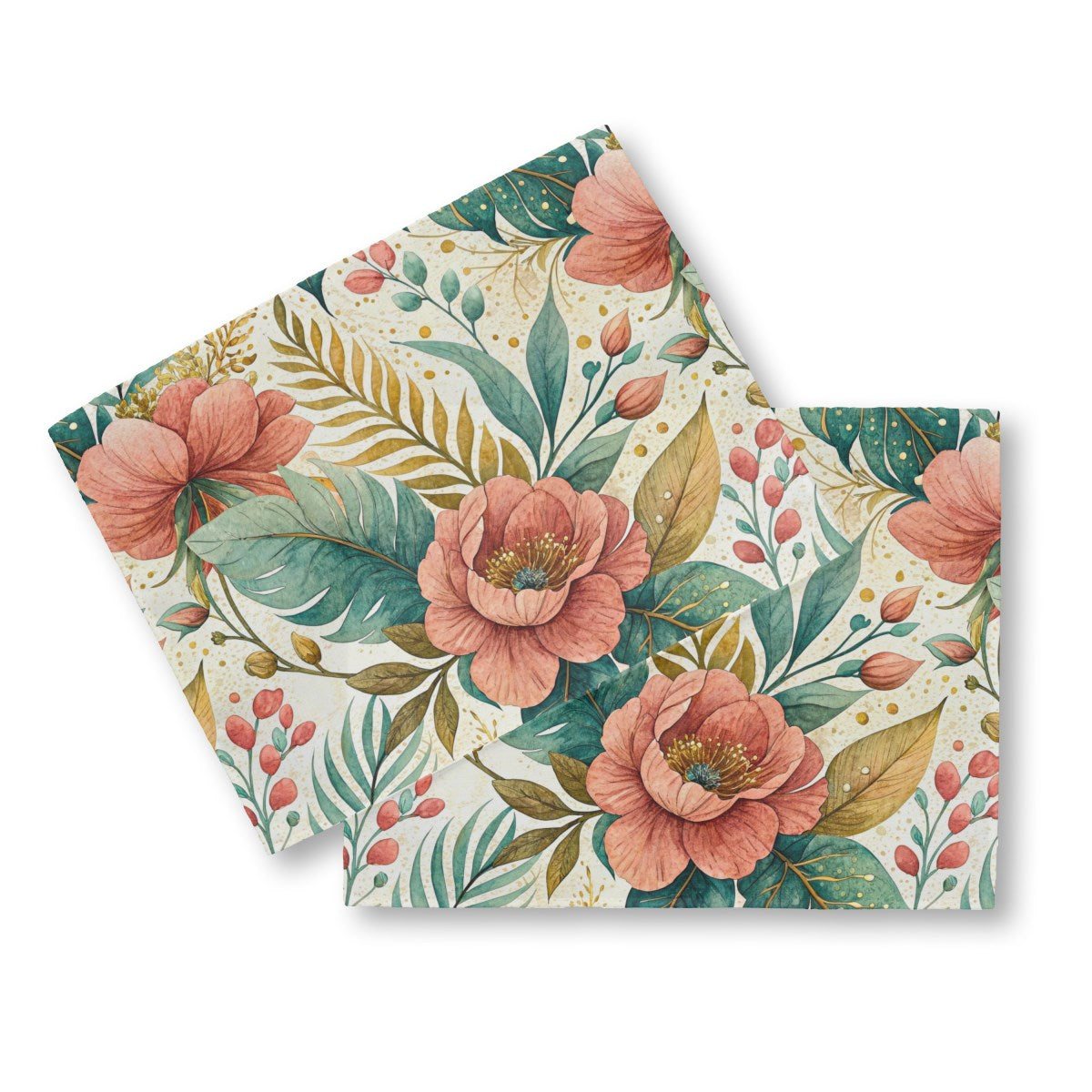 A watercolor-style botanical pattern featuring large, dusty rose flowers and lush tropical leaves in shades of teal, green, and gold. The elegant design is set on a cream background accented with golden speckles, creating a warm and artistic feel.