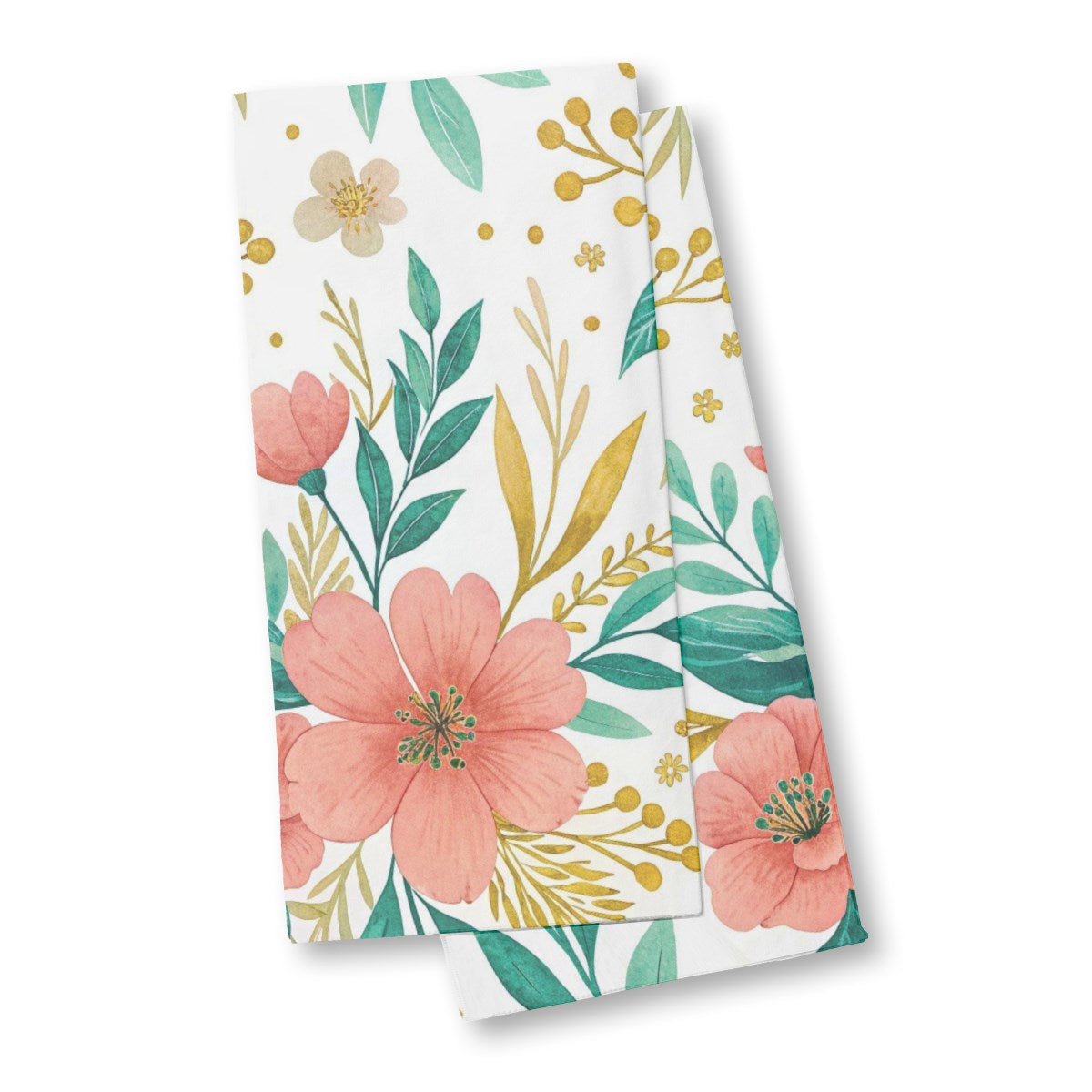 This is a vibrant watercolor floral pattern on a white background. The design features elegant coral-red flowers, teal-green and golden leaves, and delicate gold specks, creating a warm and sophisticated botanical illustration.