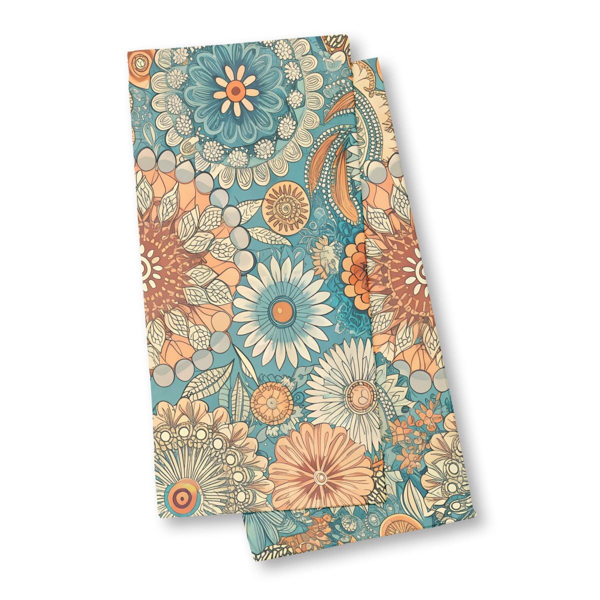 This is a vibrant, bohemian-style pattern featuring intricate, overlapping flowers and mandalas. The dense composition uses a striking color palette of teal, orange, and cream, creating a detailed and retro design with a folk-art aesthetic.