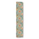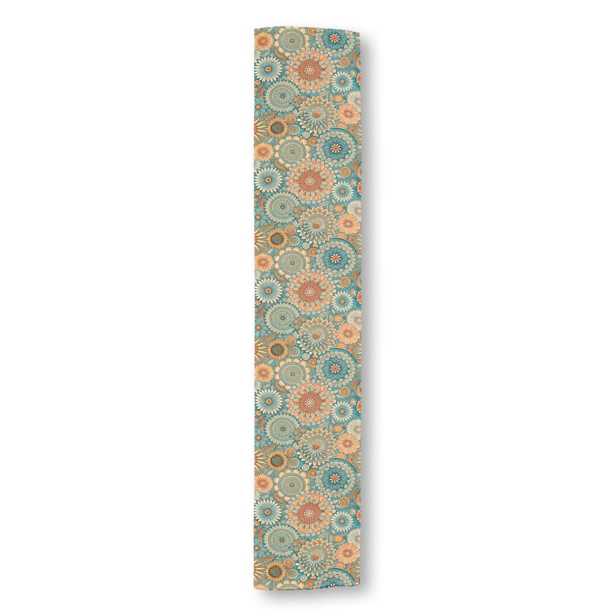 This is a vibrant, bohemian-style pattern featuring intricate, overlapping flowers and mandalas. The dense composition uses a striking color palette of teal, orange, and cream, creating a detailed and retro design with a folk-art aesthetic.