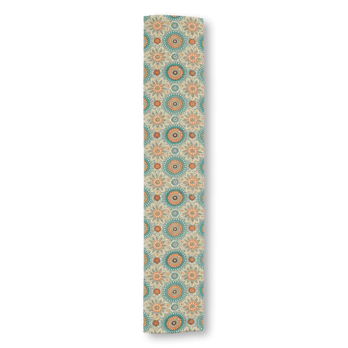 This is a vibrant, repeating pattern featuring intricate mandalas and stylized flowers in a bohemian, folk-art style. The design uses a striking color palette of teal, orange, and cream, with detailed line work and dotted textures creating a rich, layered effect.