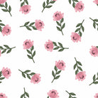 This is a seamless floral pattern featuring stylized pink flowers with a soft, watercolor-like texture. The simple blossoms, with scalloped petals and dark stamens, are attached to green leafy stems and scattered across a clean white background for a delicate and charming effect.