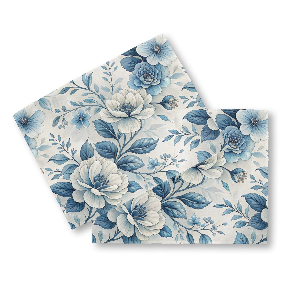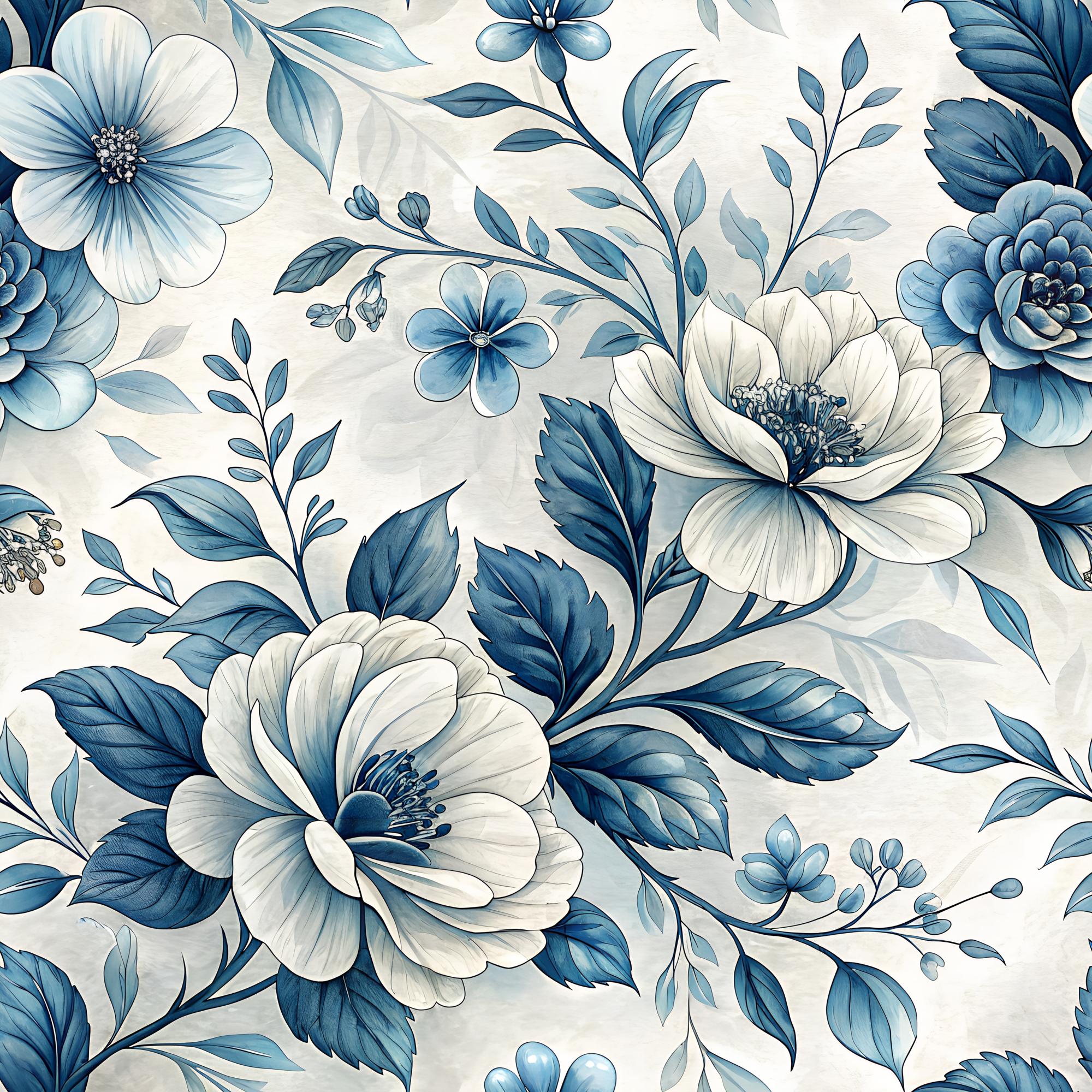 This is an elegant seamless pattern of blue and white flowers. Rendered in a delicate, watercolor-like style, the blossoms and dark blue leaves are set against a light, textured background, creating a classic and serene botanical design.