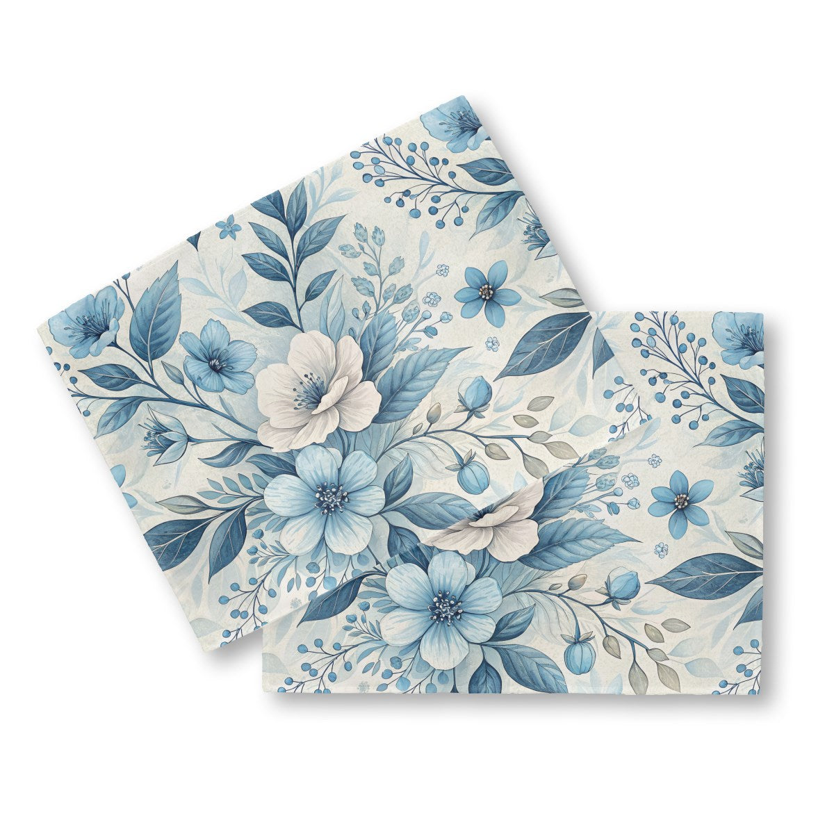An elegant watercolor-style illustration of a floral pattern. The serene composition features delicate blue and white flowers, deep blue leaves, and small berries intertwined on a light, textured background, creating a classic and tranquil design.