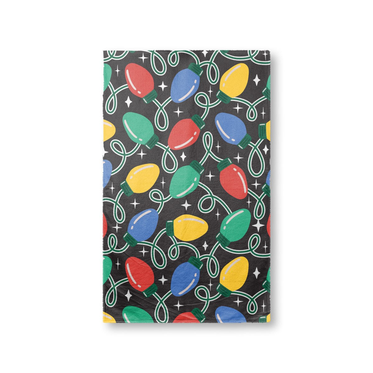 A festive, repeating pattern of colorful Christmas lights. The red, blue, green, and yellow bulbs are strung on looping white wires against a black background. White sparkles add a touch of magic to the cheerful, retro-style holiday design.