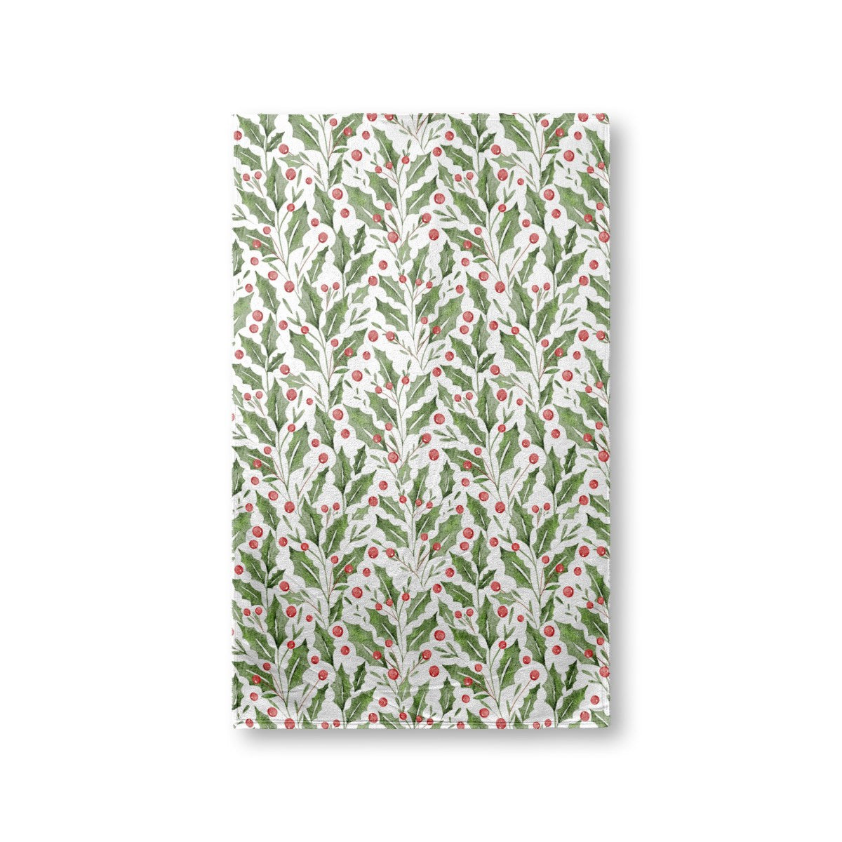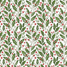 This is a seamless watercolor pattern of festive holly. Spiky green leaves and bright red berries are arranged in vertical sprigs against a white background, creating a classic and cheerful Christmas design.