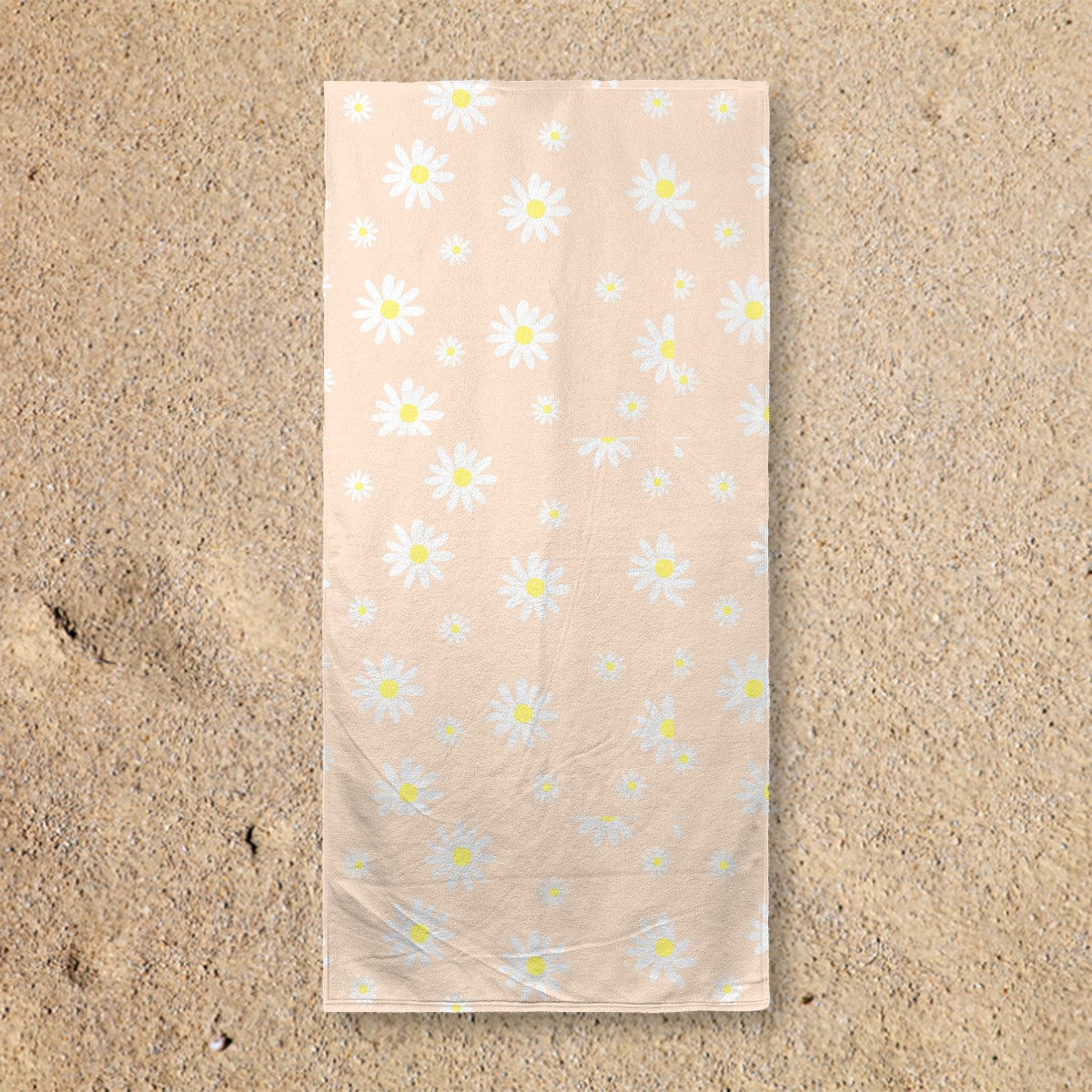 This is a simple, seamless pattern of stylized daisies. White flowers with yellow centers, in various sizes, are scattered across a soft, pale peach background for a sweet and gentle effect.