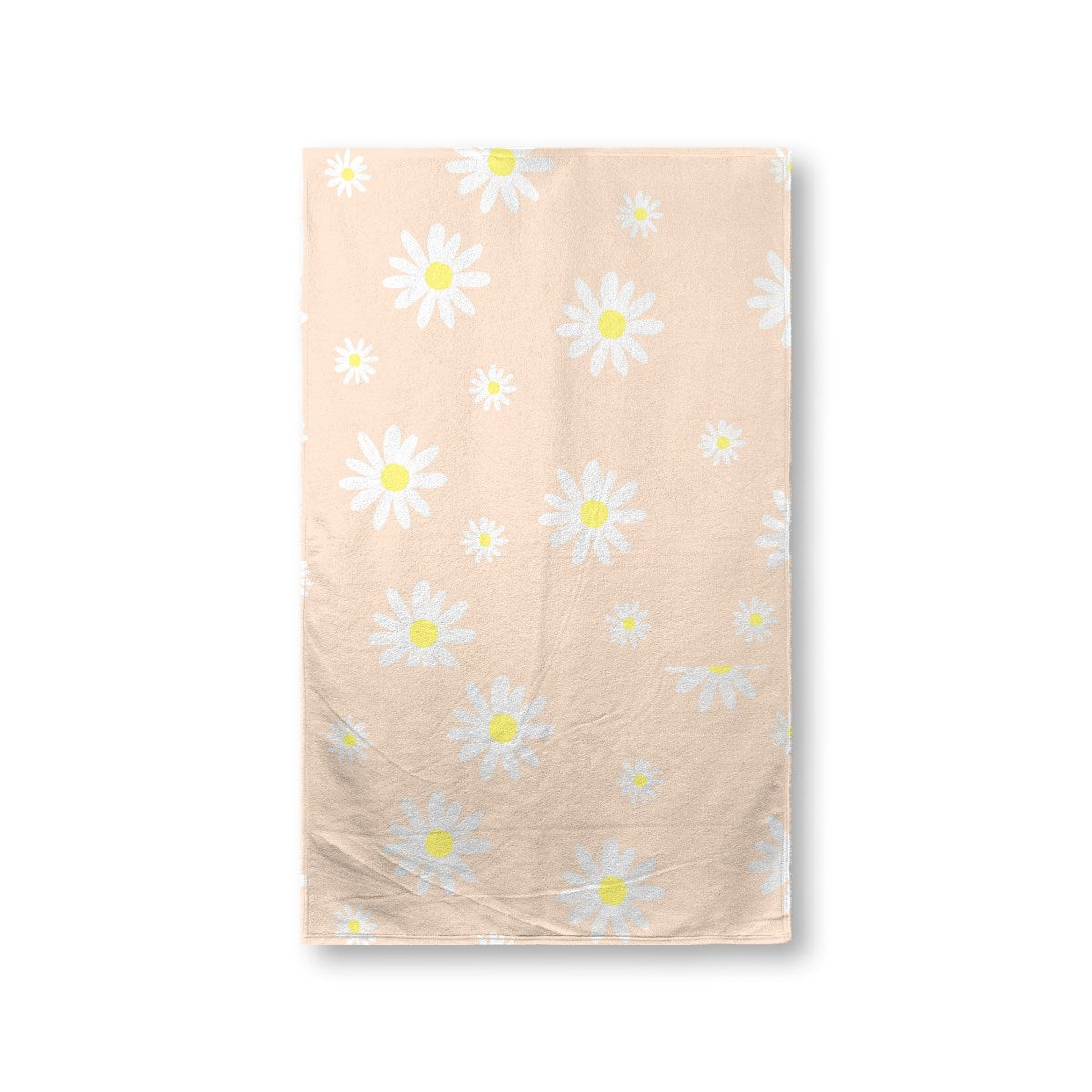 This is a simple, seamless pattern of stylized daisies. White flowers with yellow centers, in various sizes, are scattered across a soft, pale peach background for a sweet and gentle effect.
