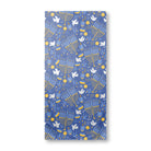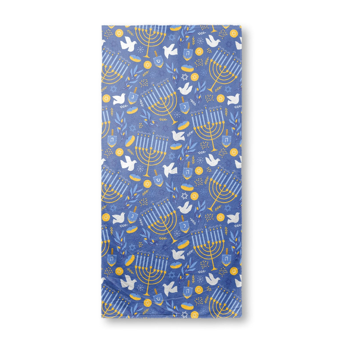 A festive, repeating pattern celebrating Hanukkah on a blue background. The design features illustrations of menorahs, dreidels, sufganiyot (doughnuts), Stars of David, and white doves in a cheerful yellow, blue, and white color palette, creating a joyful holiday theme.