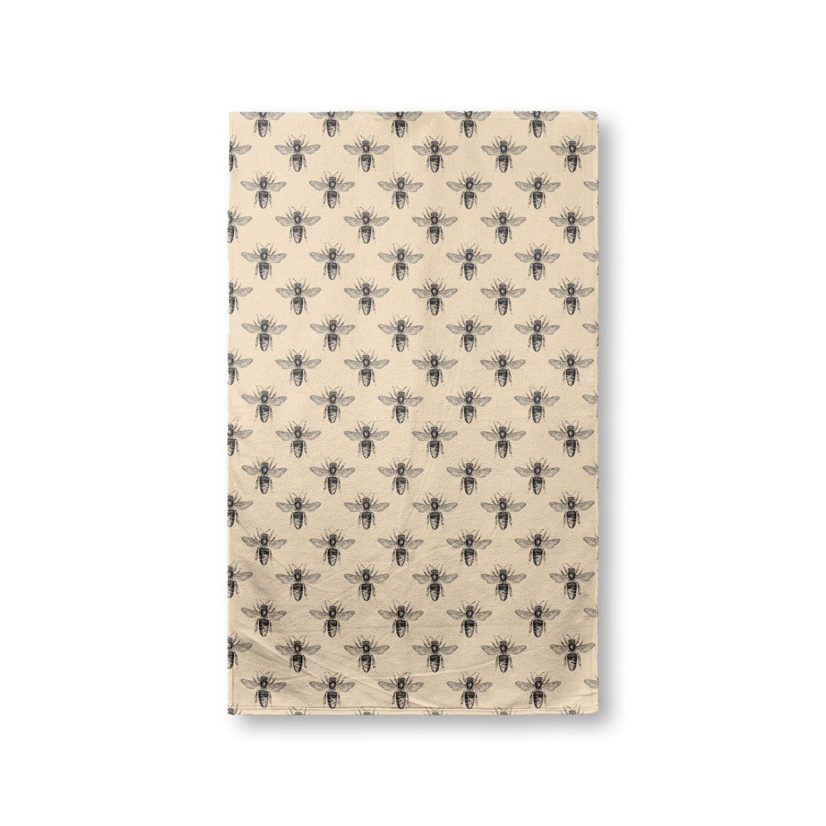 A vintage-style wallpaper pattern features detailed, black-ink illustrations of bees. The insects are arranged in a uniform grid against a solid, light tan background, creating a classic, entomological design.