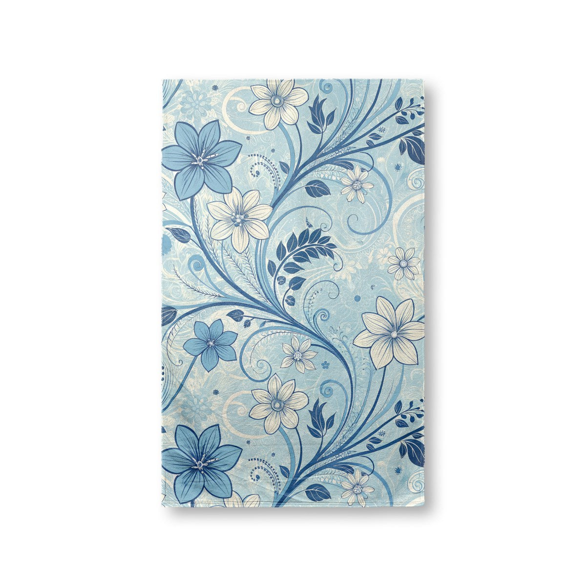 An elegant, seamless pattern of stylized flowers and swirling vines. The intricate design features a classic color palette of blue, navy, and cream against a light blue background, creating a delicate and decorative composition.