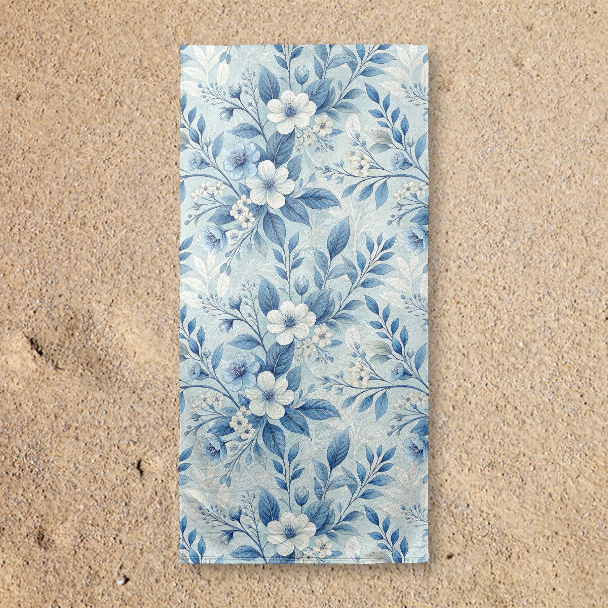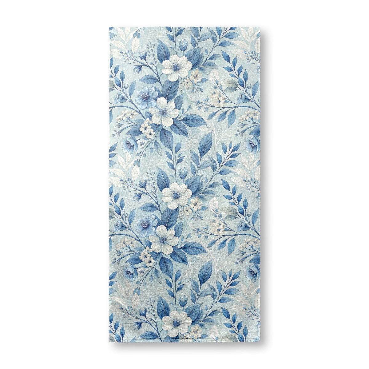 An elegant floral pattern featuring intricate white and blue blossoms with deep blue leaves. The delicate arrangement is set against a soft, textured, light blue background, creating a serene and classic design with a watercolor-like feel.