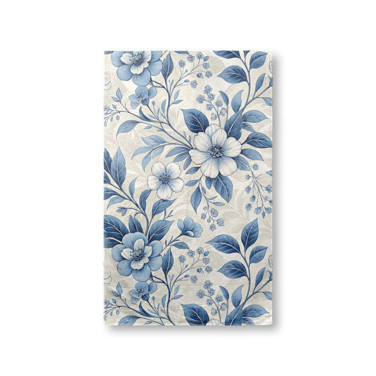 This is an elegant, seamless floral pattern in a classic blue and white palette. Intricately drawn flowers and leaves intertwine over a light, textured background, creating a timeless design reminiscent of vintage botanical illustrations or fine porcelain.
