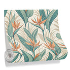 A stylized, seamless pattern of tropical flora. Vibrant orange Bird of Paradise flowers and large, teal-green leaves are illustrated against a light, textured background with muted beige foliage, creating a lush, vintage-inspired design.