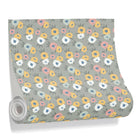 A repeating pattern of stylized flowers in yellow, pink, white, and pale blue on a muted gray-green background. Each flower features a dark blue center with white polka dots, creating a charming and whimsical design with a retro feel.