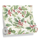 This is a seamless watercolor pattern of festive holly. The design features sprigs with spiky green leaves and clusters of bright red berries, layered over a light background with faint silhouettes of leaves, creating an elegant, classic holiday feel.