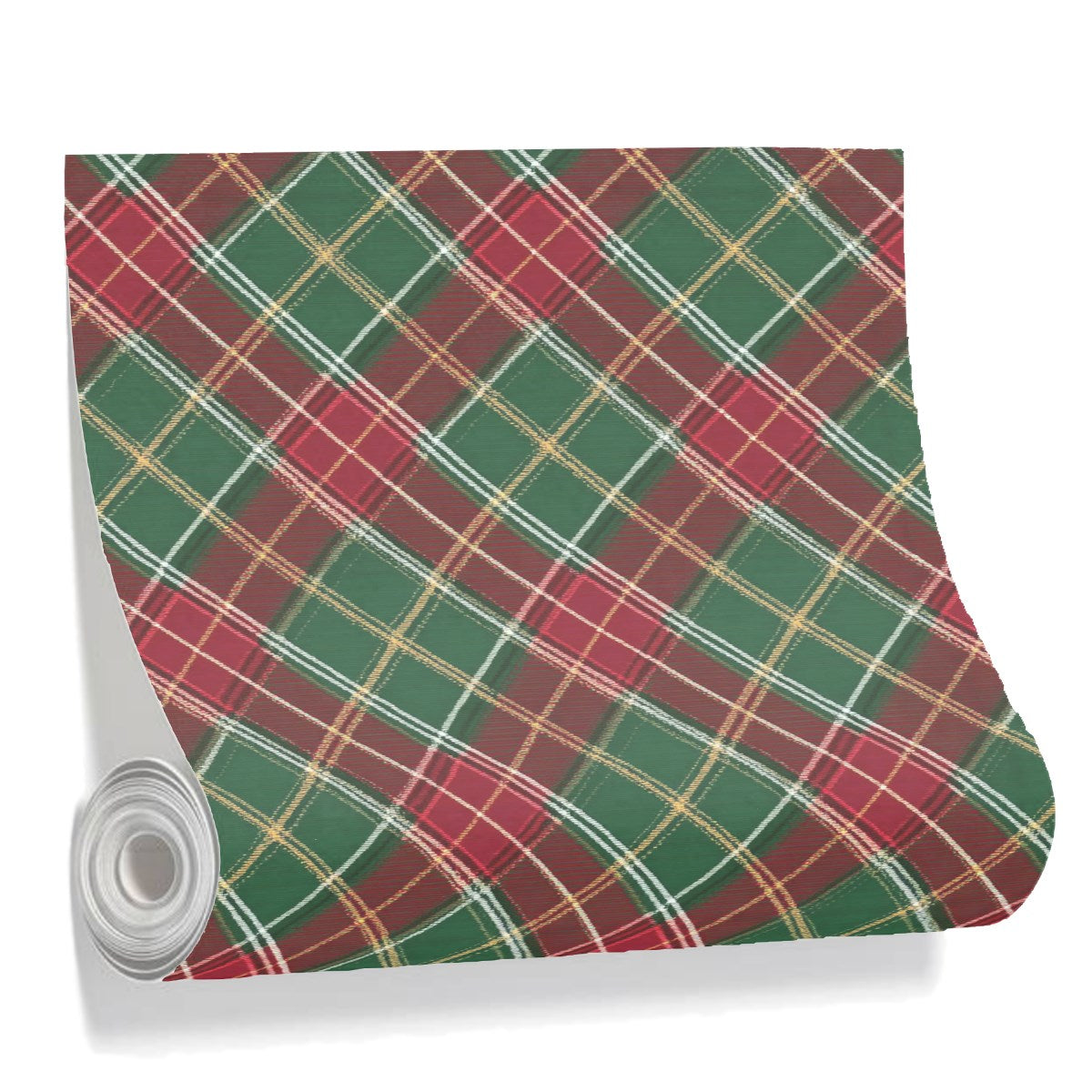 This image features a classic Christmas plaid pattern. The diagonal tartan design consists of intersecting stripes in festive colors of red, green, white, and gold. The pattern has a slightly woven texture, evoking a traditional and cozy holiday feel.