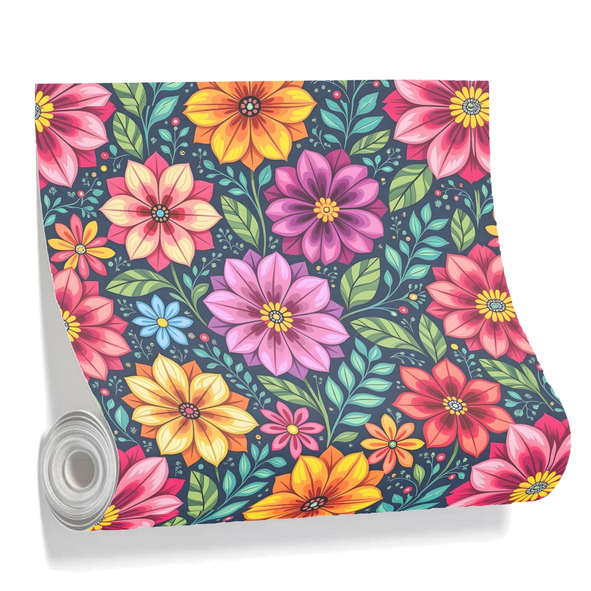A vibrant, seamless pattern of stylized flowers in a folk art style. Bold, colorful blossoms in shades of pink, orange, and purple pop against a dark navy background, intertwined with green leaves to create a dense and cheerful composition.
