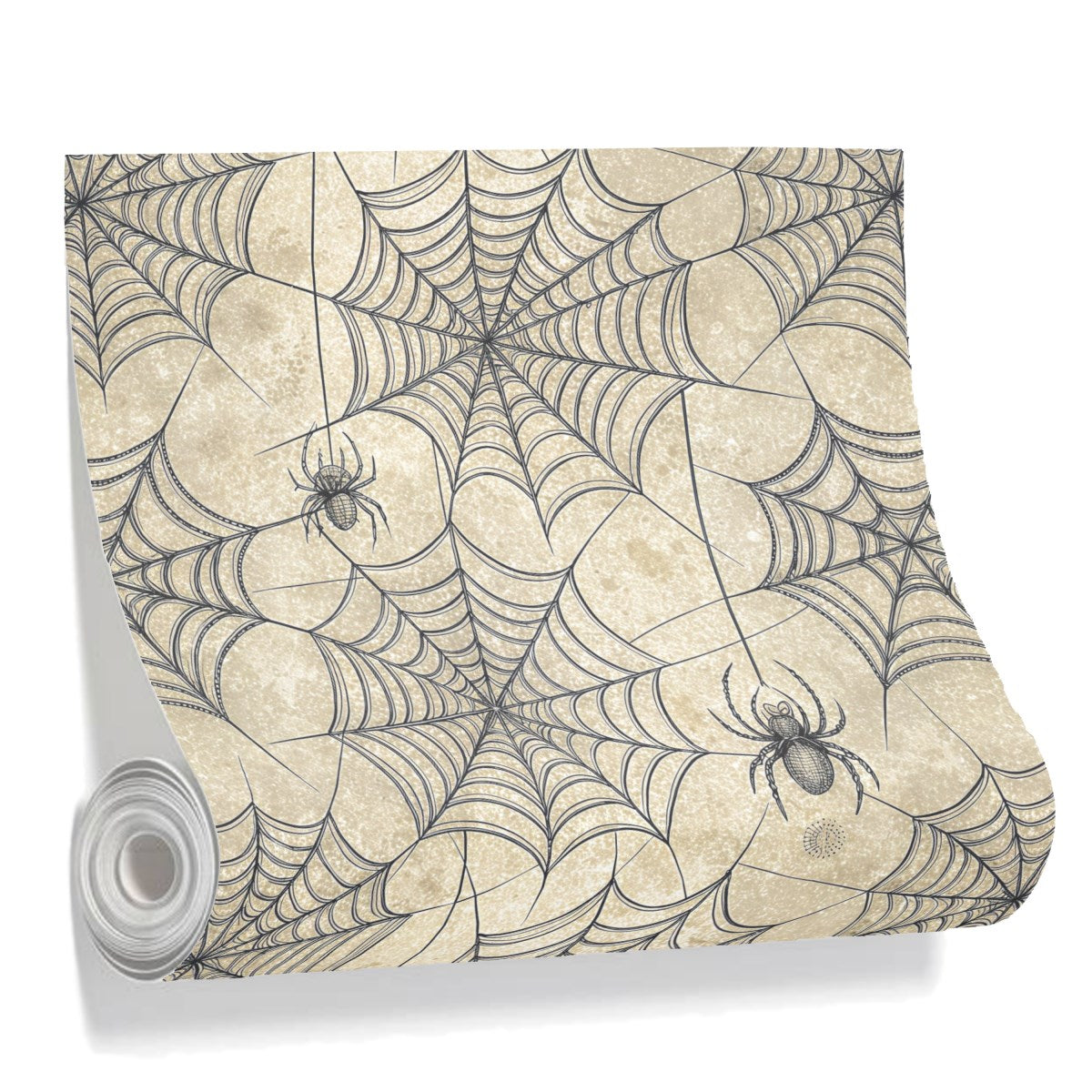 This vintage-style illustration features an intricate, repeating pattern of black spiderwebs on a textured, parchment-like background. Two detailed spiders are present, one crawling on a web and another dangling from a thread, creating a classic spooky or Halloween-themed design.