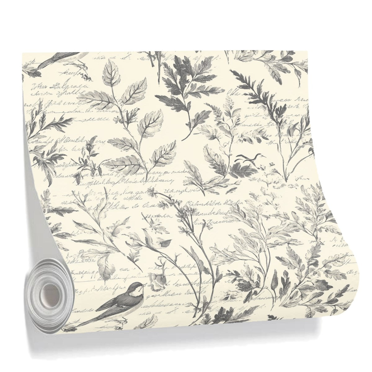This vintage-inspired, monochrome pattern features detailed botanical sketches of various plants, leaves, and a small bird. The black ink illustrations are layered over elegant, faded cursive script on a cream background, evoking the page of a classic naturalist's journal.