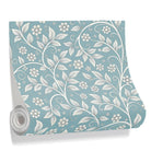 This is an elegant, seamless botanical pattern featuring intricate white line drawings of swirling vines, leaves, and small flowers. The delicate, classic design is set against a solid, muted teal-blue background, creating a sophisticated and vintage look.
