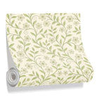 A delicate, vintage-style floral pattern featuring gracefully curving green vines and leaves on a cream background. The small white flowers have a distinctive, web-like texture on their petals, creating a charming and elegant design suitable for wallpaper or fabric.