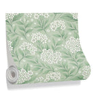 This is a seamless botanical pattern featuring elegant clusters of small white flowers and detailed green leaves. The graceful, curving stems are set against a soft sage green background, creating a classic, vintage-inspired design.