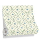 A seamless botanical pattern featuring a light green diagonal trellis on a cream background. The diamond shapes contain alternating motifs of a single blue flower and a leafy green sprig, creating a delicate, vintage-inspired design suitable for wallpaper or fabric.