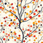 A whimsical, stylized illustration of a tree with dark, slender branches. It is adorned with round, colorful leaves or berries in warm autumnal hues of red, orange, and yellow against a light, speckled background, evoking a watercolor-style aesthetic.
