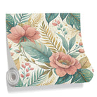 A watercolor-style botanical pattern featuring large, dusty rose flowers and lush tropical leaves in shades of teal, green, and gold. The elegant design is set on a cream background accented with golden speckles, creating a warm and artistic feel.