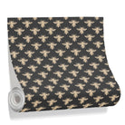 A repeating pattern of stylized golden bees with a metallic, textured finish is arranged in a uniform grid against a solid black background. The contrast creates a striking, elegant, and decorative design.