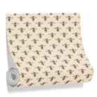 A vintage-style wallpaper pattern features detailed, black-ink illustrations of bees. The insects are arranged in a uniform grid against a solid, light tan background, creating a classic, entomological design.