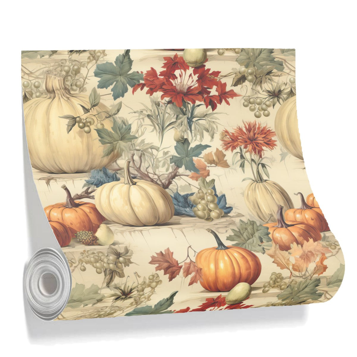 A vintage-style illustration of a bountiful autumn harvest. Orange and pale pumpkins, grapes, and colorful foliage are arranged on tiered stone ledges, creating a rich, decorative pattern with a classic, botanical feel.