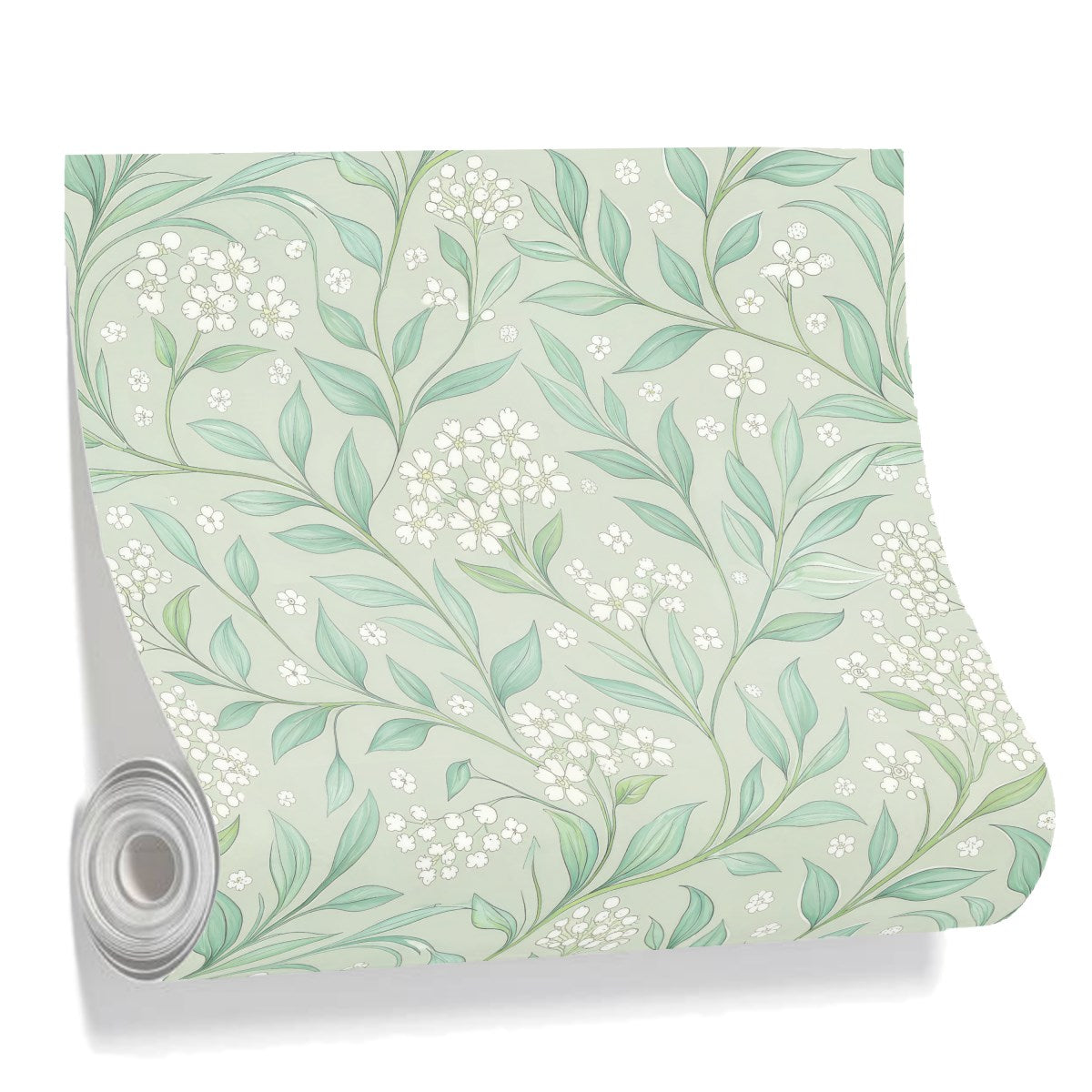 A serene, seamless botanical pattern of delicate white flowers and gracefully swirling green leaves. The elegant, illustrative design is set against a soft sage green background, creating a timeless and tranquil aesthetic with an Art Nouveau influence.