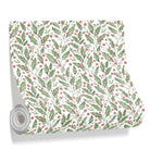 This is a seamless watercolor pattern of festive holly. Spiky green leaves and bright red berries are arranged in vertical sprigs against a white background, creating a classic and cheerful Christmas design.