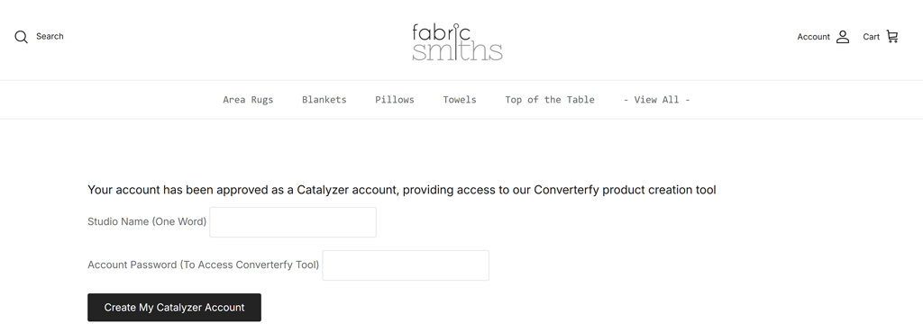 Just create a FabricSmiths store account then send us a message detailing why you would like a Catalyzer account.