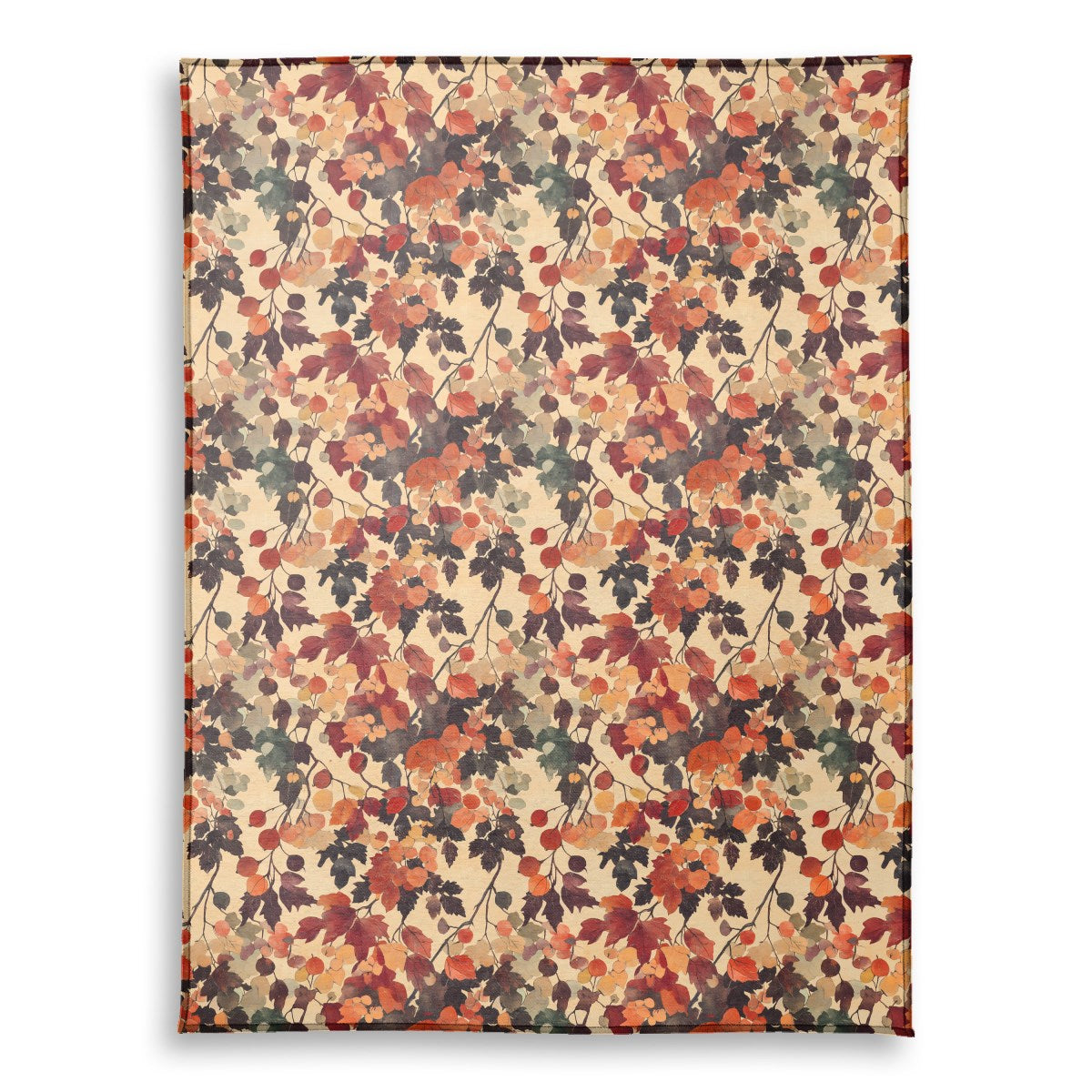 This stylized, artistic pattern features autumnal branches with leaves in rich reds, oranges, and deep purples. Clusters of round berries are scattered throughout the warm-toned foliage, set against a pale, textured background, creating a classic, decorative composition reminiscent of Japanese screen painting.