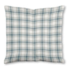 The image shows a seamless pattern of a plaid design. The base is off-white, with intersecting lines of teal, light grey and beige.