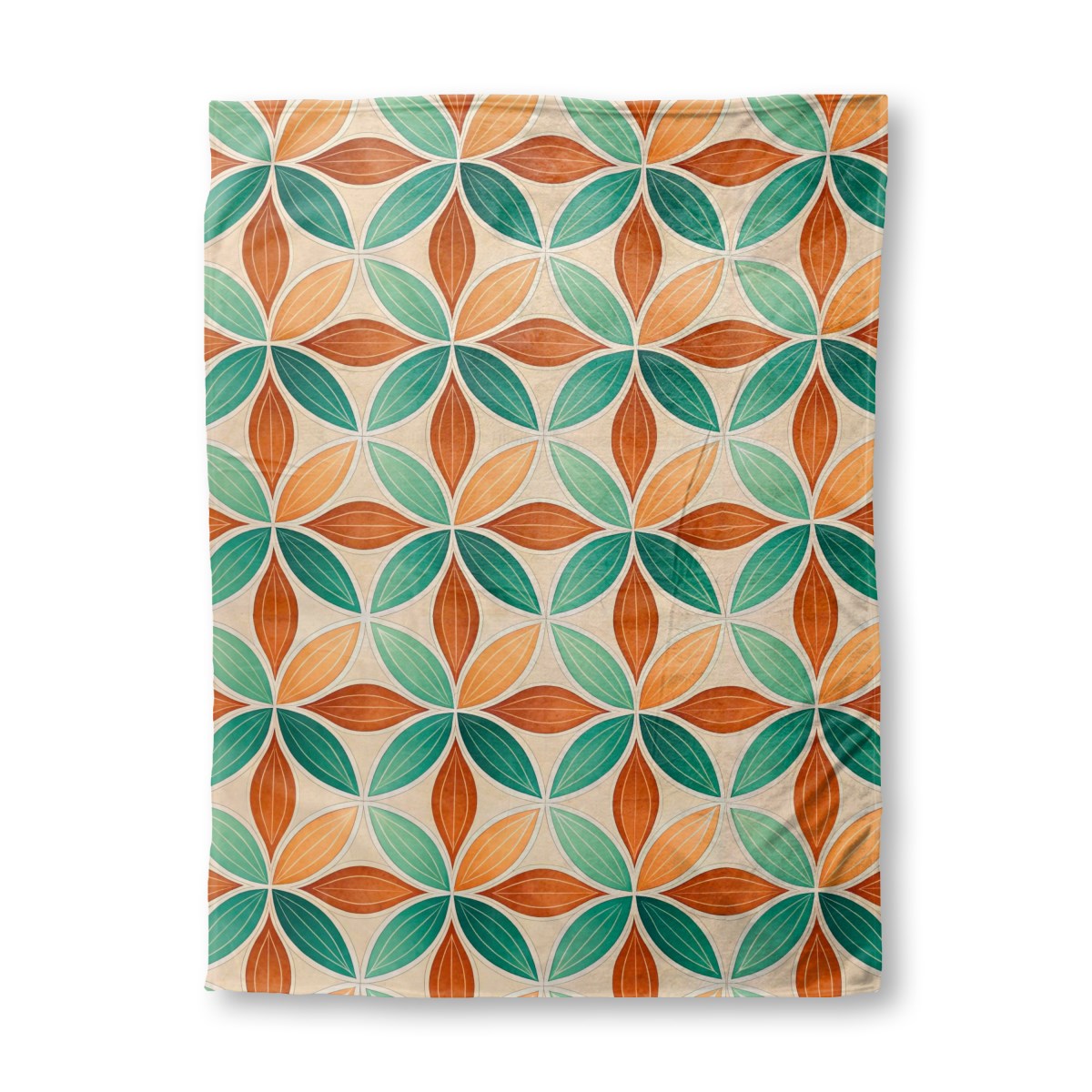 A retro geometric pattern featuring stylized flowers with alternating teal and terracotta-orange petals. The seamless design is set on a cream, textured background, creating the look of vintage ceramic tiles with a mid-century modern aesthetic.